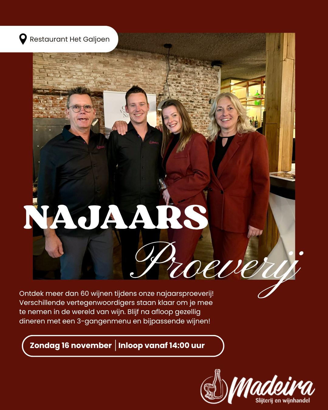 Wijnproeverij en diner met Slijterij Madeira door admin | okt 20, 2022 | Algemeen, Nieuws Wijnproeverij!! Ben je erbij, bij de wijnproeverij met diner op zondag 16 november a.s. Dit organiseren we samen met Slijterij Madeira Bel voor informatie:0174-769066 Vandaag zijn we open vanaf 10.00 uur. Dinsdags en woensdags gesloten.