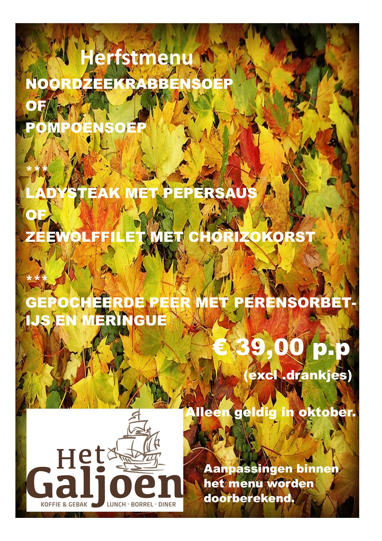3-Gangen-keuzemenu oktober Herfstmenu door admin | okt 31, 2022 | Algemeen, Nieuws Zoveel leuke reactie op ons 3-gangen-” Zomer-Gevoel”. Dat we dat in oktober ook gewoon gaan doen. Kom in oktober genieten van een heerlijk 3-gangen-keuzemenu voor slechts € 39,00 per persoon. Tot snel. Reserveren: 0174-769066